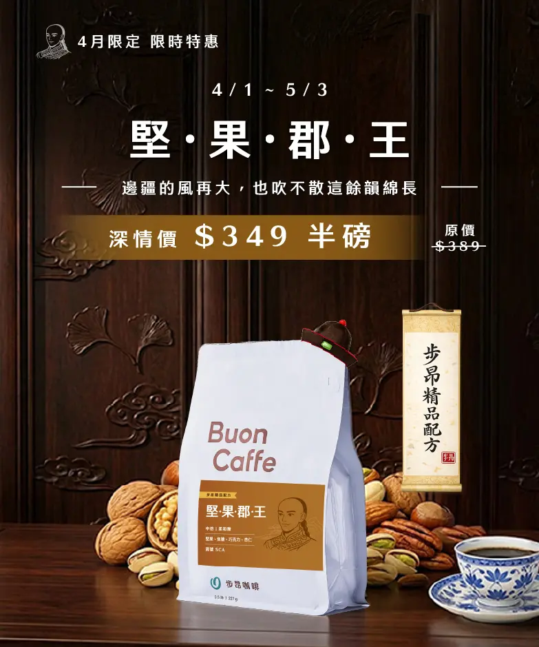 |本月新品| 步昂烘豆團隊,每月杯測打樣超過近百支咖啡豆,每月嚴選10-20支新品,與您分享 快速檢視圖示 衣索比亞 西達馬 班莎鎮 蓋迦莊園 蜜處理 G1 半磅 409元 百克 205元 一磅 777元 2.2磅 1620元 快速檢視圖示 衣索比亞 耶加雪菲 萊麗莎村 遮蔭慢乾日曬 G1 半磅 379元 一磅 720元 2.2磅 1501元 快速檢視圖示 衣索比亞 西達馬 班莎鎮 斑鳩處理廠 水洗 G1 半磅 349元 一磅 663元 快速檢視圖示 衣索比亞 西達馬 阿貝果那鎮 波淇莎村 日曬 G1 半磅 449元 一磅 853元 快速檢視圖示 哥斯大黎加 里瓦斯人處理廠 香柏莊園 卡杜艾 紅蜜 半磅 349元 快速檢視圖示 宏都拉斯 聖文森處理廠 小蘋果莊園 埃德加小農 IH90 日曬 半磅 409元 百克 205元 一磅 777元 快速檢視圖示 衣索比亞 古吉 安格斯獅子王 日曬 G1 半磅 389元 快速檢視圖示 衣索比亞 西達摩 茉莉雅 檸檬花蜜 水洗 半磅 349元 點此看更多「本月新品」 |熱銷品項| 每月限定的超值優惠,馬上選購 特價 快速檢視圖示 <每週優惠>【卓越小農系列】瓜地馬拉 佛蘭迪·奧蘭德 Fredy Oranto 藝伎 日曬 特惠 999元 $NT 1169 特價 快速檢視圖示 <每週優惠>尼加拉瓜 聖母石 La Roca 水洗 特惠 399元 $NT 439 百克 220元 一磅 834元 2.2磅 1738元 五磅 3732元 評分 5.00 滿分 5 特價 快速檢視圖示 <每週優惠>麥芽糖風笛手 特惠 239元 $NT 279 一磅 406元 $NT 474 2.2磅 862元 $NT 1007 五磅 1864元 $NT 2176 評分 4.76 滿分 5 特價 快速檢視圖示 午後小奢侈 PLUS 1+1(半磅x2) 特惠 949元 $NT 1158 特價 快速檢視圖示 美好日曬組合 (半磅x2) 特惠 699元 $NT 828 特價 快速檢視圖示 堅果調 (半磅x2) 特惠 649元 $NT 788 特價 快速檢視圖示 SOE甜感組(半磅X2) 特惠 739元 $NT 898 特價 快速檢視圖示 堅果郡王(加奶、黑咖啡兩用) 半磅 349元 $NT 389 一磅 739元 2.2磅 1540元 五磅 3307元 點此看更多「熱銷品項」 C³offee 咖啡誌 – 專業咖啡職人雜誌報導 蝦皮大學 – 如何透過「科技化烘焙」打造高品質咖啡 網友真實評價推薦